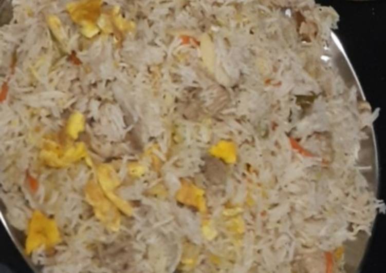 - Take a pan put in a ghee and chicken Cook and ginger garlic paste and salt to taste and green pepper and carro mixe well water mixe well add basmati rice mixe well and cook.