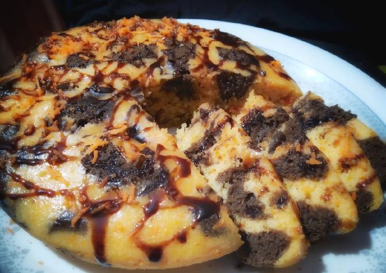 - Pre heat the oven, grease baking tin keep it ready, now add one tbsp of carrot mixed batter, and one tbsp of cocoa powder mixed batter in the tin side by side, fill in the entire batter in the tin in the same way..tap a bit,bake it on 180 degree Celsius for 40-45 minutes, check with tooth pick...